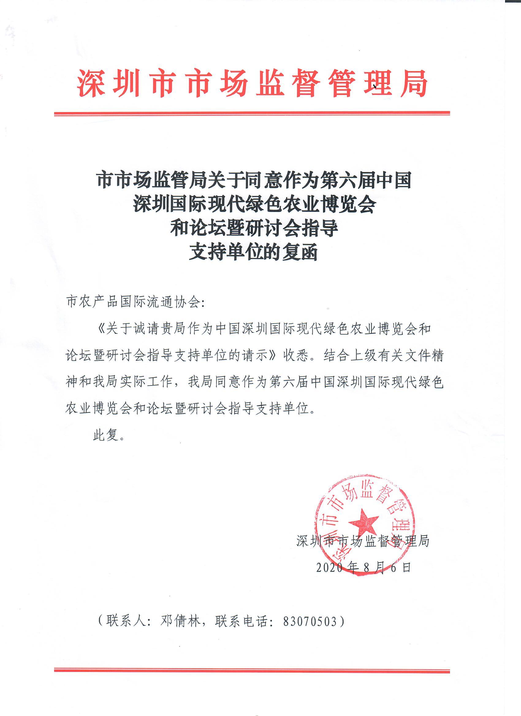 深圳市市場(chǎng)監(jiān)督管理局同意作為第六屆深圳綠博會(huì)支持單位