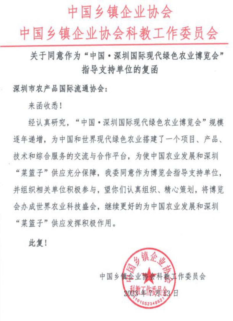 關(guān)于誠請(qǐng)中國鄉(xiāng)鎮(zhèn)企業(yè)協(xié)會(huì)作為“中國·深圳國際現(xiàn)代綠色農(nóng)業(yè)博覽會(huì)”指導(dǎo)支持單位的請(qǐng)示復(fù)函